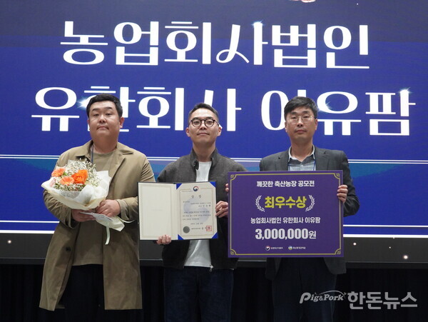 최우수상을 수상한 이유팜은 농장 주변에 가득한 꽃과 돌담길 등 조경 관리에서 차별성이 돋보였으며, 가축분뇨를 멤브레인 R.O 시스템으로 맑은 물 수준까지 정화하여 재활용수로 활용하고 있다.